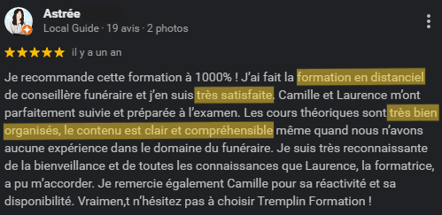 En tant que centre de formation funéraire, nous avions une demande spécifique : retravailler nos modules qui étaient trop simples sur le plan visuel. Non seulement Myriam a su viser juste malgré sa découverte récente du domaine funéraire, mais elle a également su rendre nos modules interactifs, colorés, enrichissants d’informations. Myriam a pris le temps de faire des recherches, d’approfondir les informations données afin de s’assurer que le travail soit complet. Cela nous a beaucoup plu de la voir aussi investie dans un domaine qui n’est pas le sien, preuve irréfutable de sa polyvalence qui lui permettra de répondre aux demandes de chacun et pour n’importe quel domaine professionnel. Myriam est faite pour ce métier, car elle est très attentive aux attentes de son client et sait se rendre disponible. Dans notre cas, nous sommes entièrement satisfaites du travail de qualité qui nous a été fourni. Elle est très réactive par mail, les échanges sont clairs et simples. Si vous avez besoin de clarifications, de retouches ou de revoir une page entière, elle y répondra dans la minute, ce qui est très satisfaisant. Nous n’hésiterons pas à solliciter de nouveau Myriam si besoin, sachant pleinement que son travail répondra pleinement à nos espérances : irréprochable.